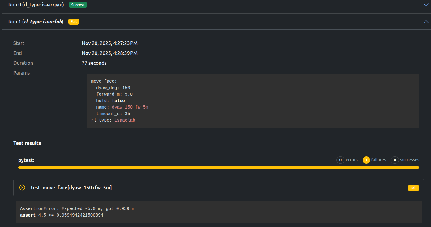 With the isaaclab policy, we see there is still work to be done. The dashboard notes the test as a fail (and shows us the failing assertion), and the birdseye video shows the robot failing to setout its goal.